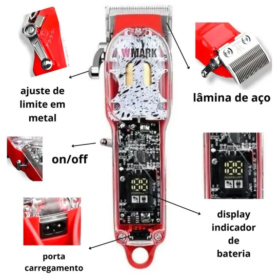 Lâminas inoxidáveis. velocidade do motor: 6500rpm. bateria de lítio: 2500 mah. Voltagem tensão: 100-240v, 50/60hz, motor de alta qualidade. Faixa ajustável da lâmina: 0,5 / 1,5 / 2,5 / 3,5 mm. Com display de capacidade da bateria LED Itens incluso: 1x Maquina de cortar cabelo 1x Lamina de cerâmica 6x Pentes de guia (1.5 / 3 / 4.5 / 6 / 9 / 12 ) 1x Escova de limpeza 1x Pente de cabelo 1x Cabo USB 1x Óleo lubrificante